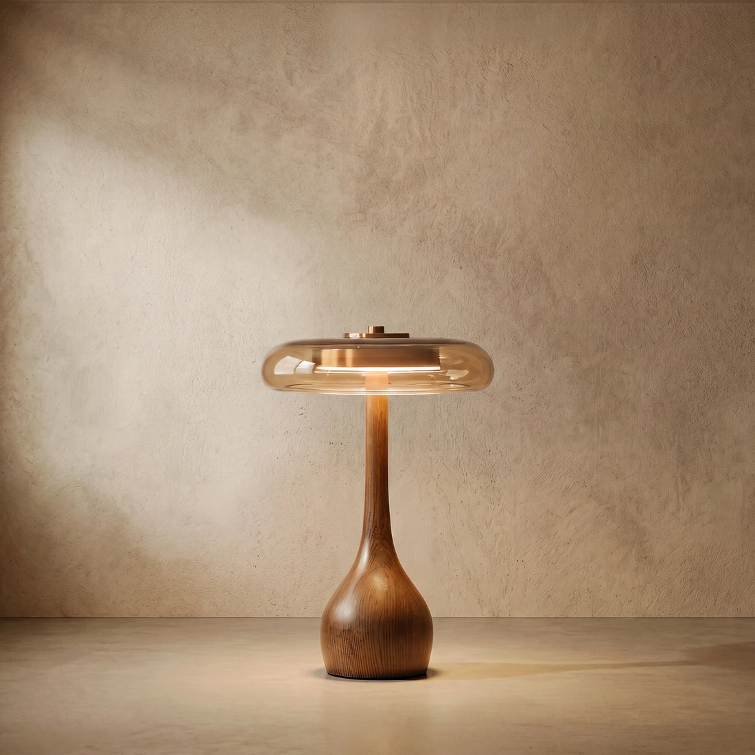 Modern Table Lamp – Wood Base & Amber Glass Shade for Desk Bedside Console