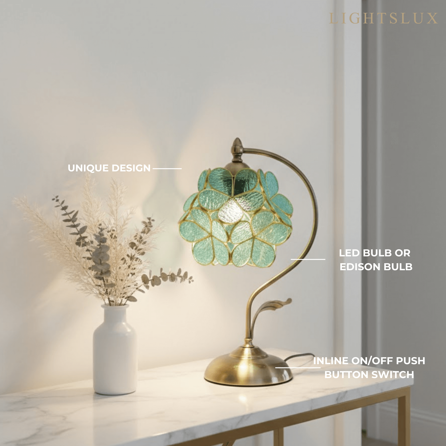 - Elegantly curved antique brass base and stem add warmth and a touch of vintage refinement
