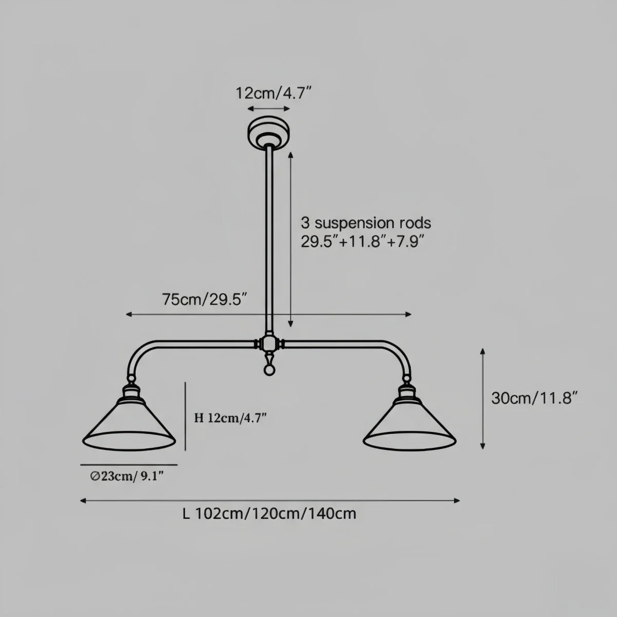 2-Lights Size: L 120cm x W 23cm x H 30cm (47.2″ x 9.1″ x 11.8″)