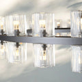 Inspired by the Art Deco style of 1920s Paris, the collection captures the period's fascination with geometric forms. Masterfully refracting the light, hundreds of faceted, dynamic prisms evoke the allure of the era. Hanging like lush fringe from a welded iron frame, the angular glass juxtaposes elegance and industrialism.